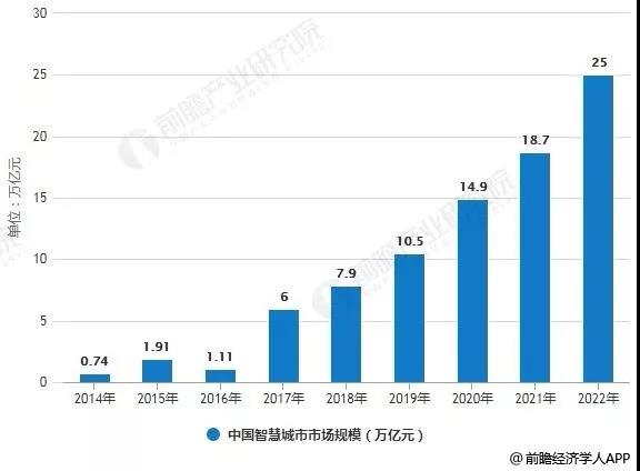 據(jù)前瞻產(chǎn)業(yè)研究院發(fā)布的《中國智慧城市建設發(fā)展前景與投資預測分析報告》統(tǒng)計數(shù)據(jù)顯示,2014年中國智慧城市市場規(guī)模僅僅為0.76萬億元。到了2016年中國智慧城市市場規(guī)模突破1萬億元。截止到2017年中國智慧城市市場規(guī)模增長至6萬億元。預計2018年中國智慧城市市場規(guī)模將接近8萬億元,達到7.9億元。2019年時中國智慧城市市場規(guī)模將突破10萬億元。未來五年(2018-2022)年均復合增長率約為33.38%,并預測到了2022年中國智慧城市市場規(guī)模將達到25萬億元。