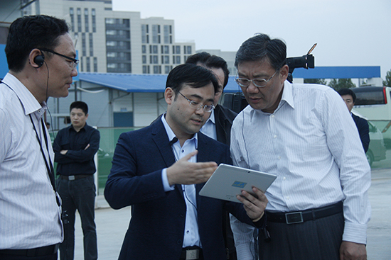 董事長鄒海濤在孫村廠房現場向王文濤書記匯報公司情況